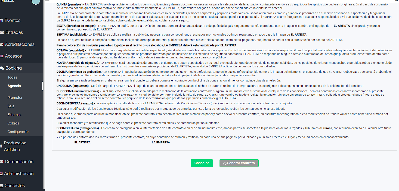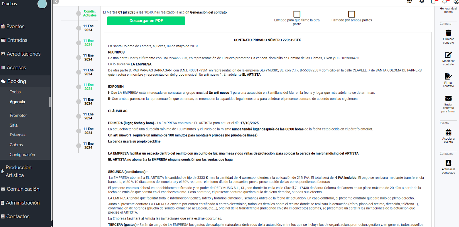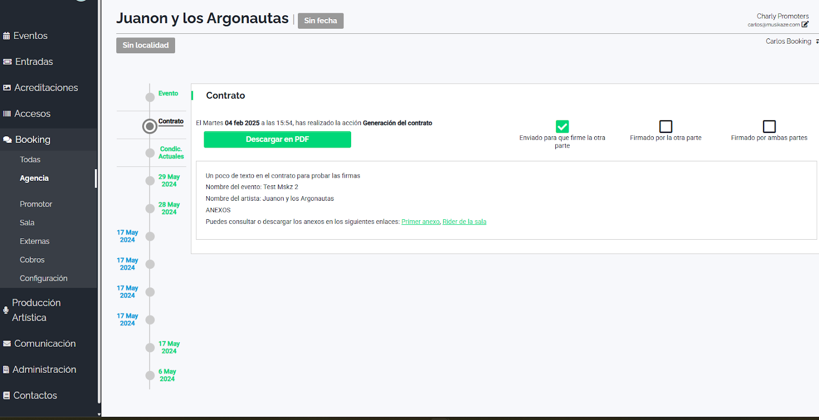 Imagina gestionar propuestas, condiciones, acuerdos y firmas de contrato en un único entorno, sin caos, sin pérdidas de información y con el control total de cada paso. Con Booking, transformarás la contratación de artistas y salas en un proceso simple, ordenado y 100% online.